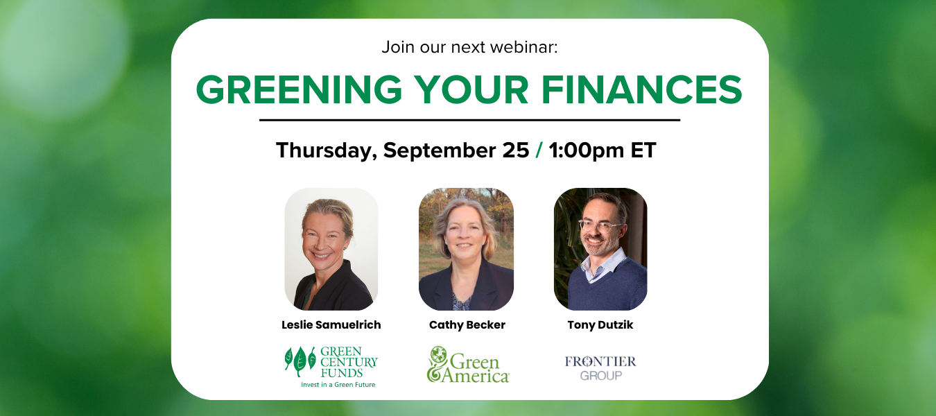 Join Green America, Green Century and Frontier Group on Thursday, September 25 at 10am PT/1pm ET to find out how you can support climate action through your finances. Join Green America and Green Century to find out how you can support climate action through your finances: banking, credit cards, insurance and investing. This webinar will introduce several new tools and guides to help you align your money with your values.