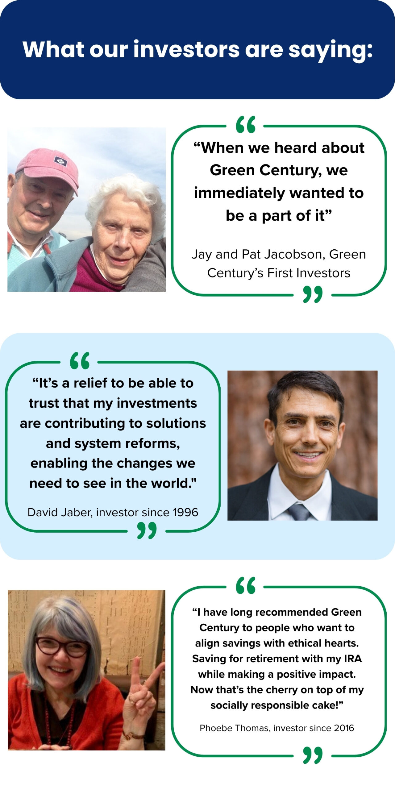 These statements are testimonials from current clients of Green Century. These clients have not been compensated in any way for their endorsement.