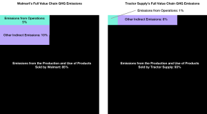 Pollution from the production and use of retail products is a major contributor to Walmart and Tractor Supply’s overall carbon footprint. And while both companies provide a breakdown of their emissions from operations, they do not disclose which product categories are responsible for the emissions caused by the products that they sell. Product emissions are many times greater than operational emissions.